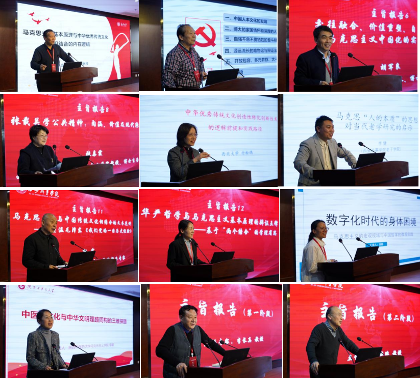 在下午场的专题报告中,十位学者从文明逻辑、实践自觉、历史寻根、数字时代身体观等角度拓展议题。长安大学教授刘吉发解析了“马中两学”“源不同而道相合”的内在逻辑,提出文明融合的“三段演进”理论。西北大学哲学院副院长胡军良从“交往融合、价值重塑、自主创构”三维度,阐释马克思主义中国化的实践自觉。西安交通工程学院马克思主义学院院长段联合从人本文化发端、家国人民情怀、自强奋斗精神、唯物辩证法根基、兼容并包意识等五个方面,阐释了中国共产党初心使命的历史文化根脉。西北大学教授付粉鸽教授界定了中华优秀传统文化,阐述了“两创”的逻辑前提,并梳理了其实践路径。西安外事学院老子学院院长李健结合马克思“人的本质”思想,探讨当代老学研究的新范式;马克思主义学院教授张亲霞解析了张载关学公共精神的内涵与价值,强调其现代转化需内涵转化、价值重构和路径开拓;马克思主义学院副教授郭宪则以毛泽东文本为例,揭示了“马中结合”的历史经验。此外,学者们还围绕华严哲学与马克思主义辩证互释、数字化时代身体困境、中医药文化与中华文明理路等前沿议题展开跨学科对话。主旨报告环节由西安外事学院马克思主义学院副院长杜红娜主持。